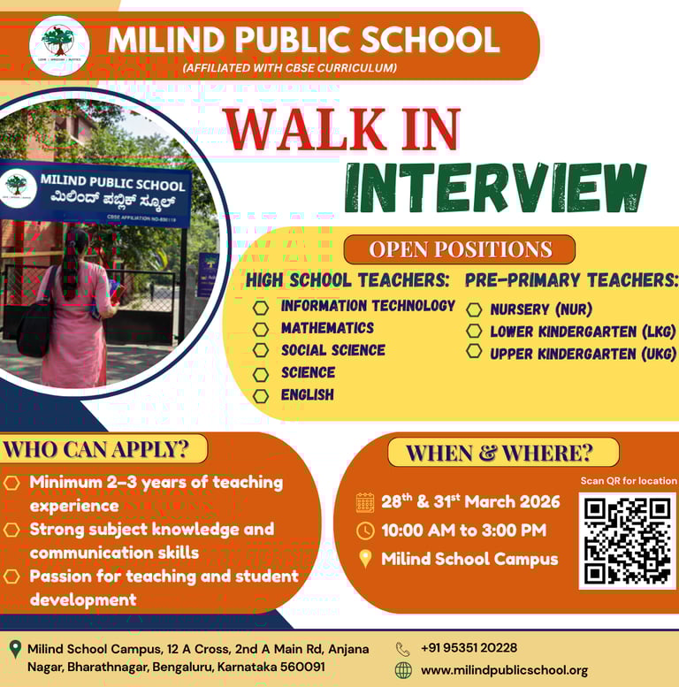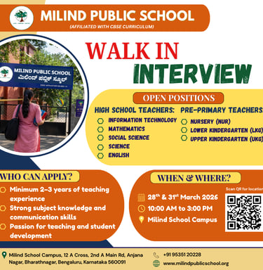 Milind Public School invites passionate, qualified, and dedicated educators to be a part of our vibrant academic community. If you are enthusiastic about shaping young minds and contributing to student growth, we welcome you to attend our walk-in interview.